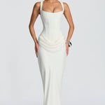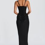 The Canai maxi dress features an architectural design with a structured crepe bodice and a flowing lyocell skirt.