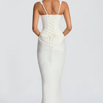 The adjustable lace-up back allows for a personalized fit. Non-stretch crepe and woven lyocell. Maxi length.