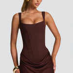 The square neckline and tapered straps emphasize the fitted silhouette, while the low waist is extended by a satin wrap adorned with deep pleats.