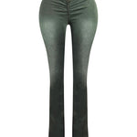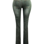 Jean en denim taille basse avec coupe en V, détails froncés et effilochés.